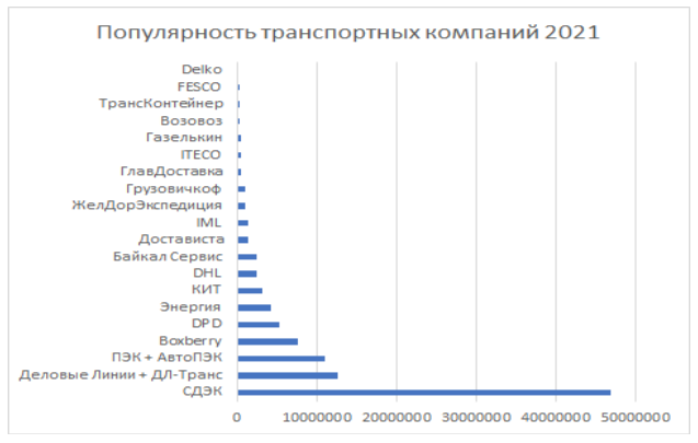 По популярности бренда с большим отрывом лидирует транспортно-логистическая компания СДЭК, на втором месте компания Деловые Линии, на третьем ПЭК. В целом список ТОП10 не изменился по сравнению с 2020 годом.